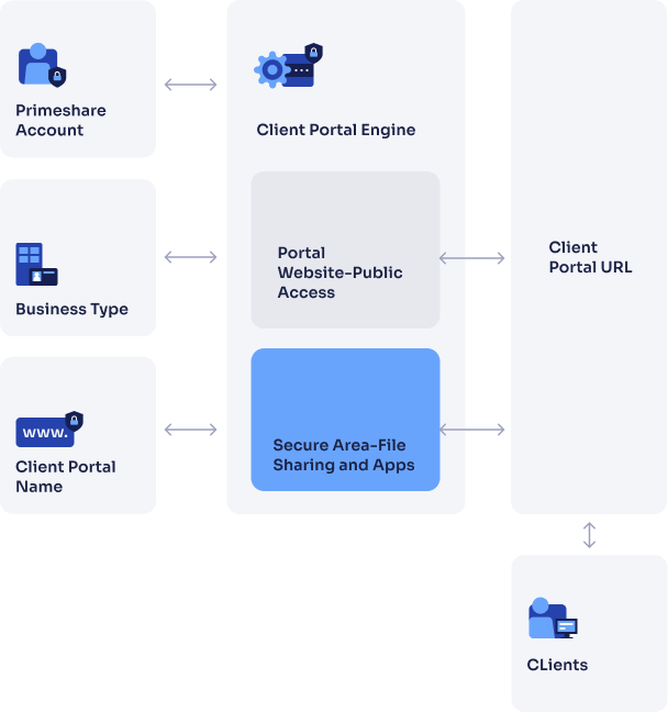 Primeshare's Client Portal Engine utilizes your login to Primeshare, your business template, and your desired portal name to create your client portal in only a few minutes. The portal you create will include a public-facing URL for all visitors (Portal Website) and a Secure Area for authenticated users.