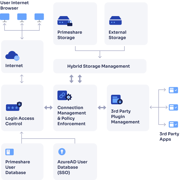 Once a user is successfully authenticated, the Connection Management and Policy Enforcement Module will verify and assign the proper authorization rules for the user. These include permissions on folders and files, password requirements, or even the IP address from which the user is allowed to access the portal. Thereafter, the user will be directed to your defined storage location where he/she can access, download, or upload files. Files can be stored on Primeshare, Dropbox, Google Drive, or on your own Amazon S3 location.