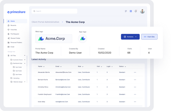 Primeshare is the only file sharing platform that allows you to create your own client portal in minutes, with best-in-class security, and the ability to choose between the cloud, local servers or a hybrid solution.